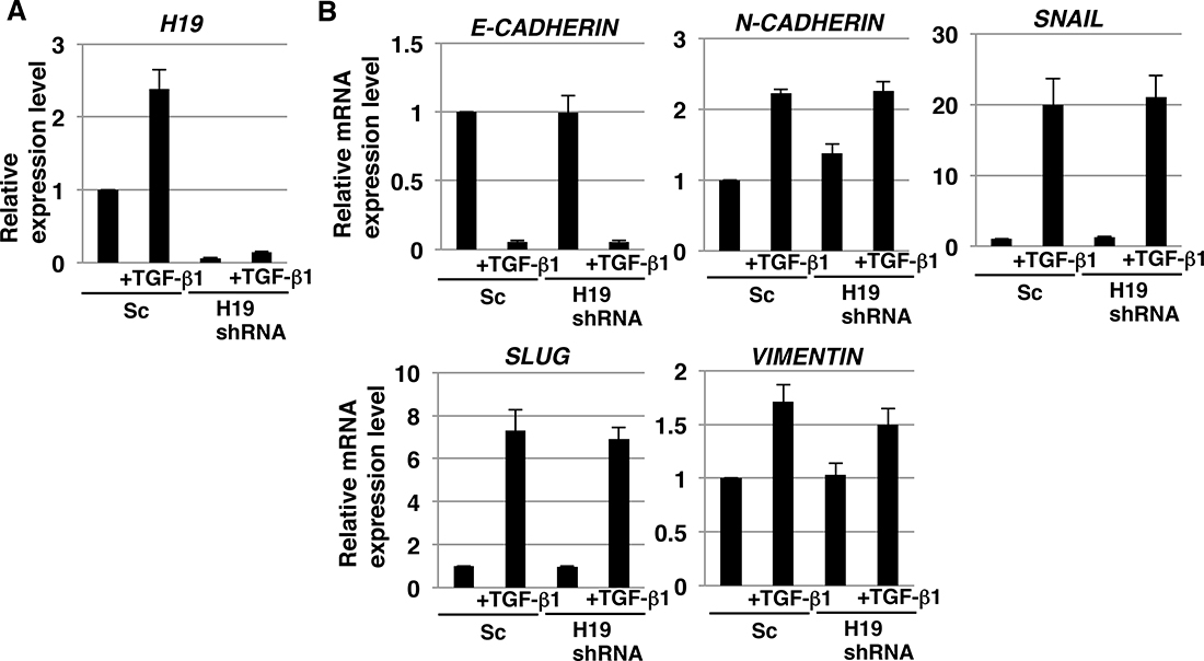 H19 has been reported to play a role in epithelial to mesenchymal transition (EMT), which is the initial key process required for tumor metastasis in certain cancer cells [35–37]. However, no study thus far has clarified the contribution of H19 to the EMT of PDAC cells. As discussed in the preceding sections, our results demonstrated H19 involvement in EMT-like behaviors such as cell adhesion and invasion. We therefore investigated whether H19 plays a role in the EMT of PDAC cells. qRT-PCR analysis revealed that H19 expression was increased in Sc cells, but not H19-knockdown cells, after treatment with even comparatively lower concentrations of transforming growth factor-β1 (TGF-β1) (2 ng/mL) (Figure 8A), and EMT-marker expression was confirmed to be substantially altered in PANC-1 cells treated with TGF-β1 at various concentrations (0.5–4 ng/mL) (unpublished data); this suggested the involvement of H19 in EMT. However, the decrease in E-CADHERIN and increase in other EMT markers were comparable in Sc and H19-knockdown cells (Figure 8B). Based on these results, we propose two reasons for the lack of a major contribution of H19 in the EMT of PDAC cells: one, TGF-β1 signaling is functionally independent from H19 contribution; and two, the effect of TGF-β1 signaling predominates when compared with the effect of H19 in PDAC.