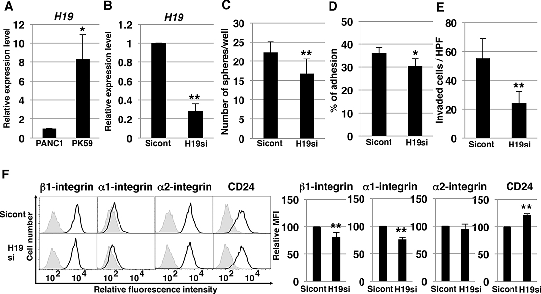 Figure 9: H19-knockdown effect on PK-59 PDAC cells. (A) qRT-PCR analysis of H19 was performed using cDNA derived from PANC-1 and PK-59 cells. *P < 0.05. (B) qRT-PCR analysis of H19 was performed using cDNA derived from Sicont and H19-knockdown (H19si) PK-59 cells. Results are normalized relative to the values obtained for sicont cells (value = 1). **P < 0.01. (C) Results of sphere-formation assays showing decreased sphere formation by H19-knockdown (H19si) PK-59 cells. **P < 0.01. (D) Adhesion assays were performed on Sicont and H19-knockdown (H19si) PK-59 cells. *P < 0.05. (E) Matrigel invasion assays were performed on Sicont and H19-knockdown (H19si) PK-59 cells. **P < 0.01. (F) Flow-cytometry analysis of integrin and CD24 levels in Sicont and H19-knockdown (H19si) PK-59 cells. Controls are indicated by thin lines with gray color. MFIs relative to Sicont cells are shown on the right side. Results are presented as means ± SD from three independent experiments. **P < 0.01.