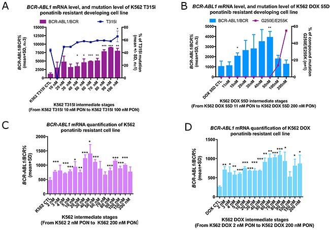 Figure 1: Increased T315I% was detected in the K562 T315I cell line during development of ponatinib resistance. Reduction of BCR-ABL1 mRNA overexpression coincided with the emergence of a compound mutation in the development of K562 DOX 55D-R ponatinib resistant cell line. Overexpression of BCR-ABL1 mRNA level was observed in the intermediate cell lines, and the final (A) K562 T315I-R (100 nM) and (D) K562 DOX-R (200 nM) resistant cell lines, but not the (B) K562 DOX 55D-R (200 nM) and (C) K562-R (200 nM) resistant cell lines. (A) The percentage of T315I mutation was also increased in the K562 T315I-R (100 nM) cell line. (B) The reduction in the overexpression of BCR-ABL1 in 100 nM intermediate followed the emergence of the compound mutation G250E/E255K. No mutation was detected in the (C) K562-R (200 nM) or (D) K562 DOX-R (200 nM) resistant cell lines. Error bars represent SD. mRNA expression represents the mean of at least three independent experiments performed in triplicate, *p<0.05, **p<0.01 and ***p<0.005 compared to the corresponding parental control lines (CTL).