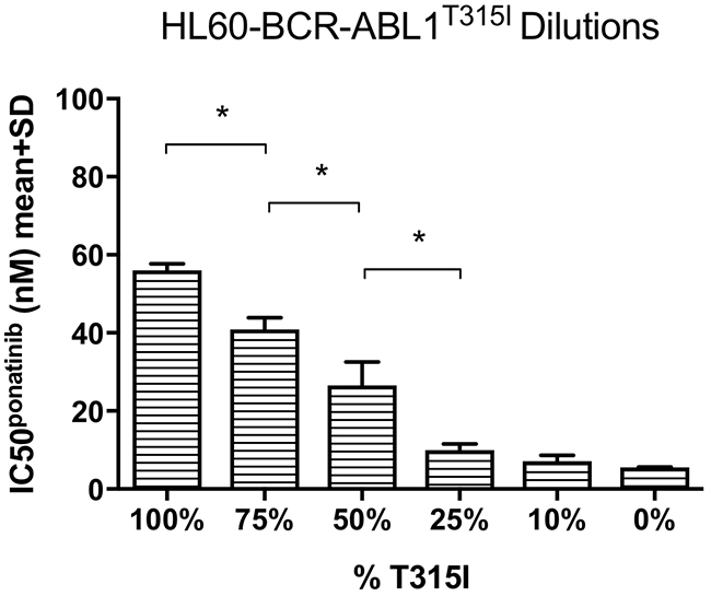 Figure 2: Ponatinib IC50 decreased in response to gradual reductions in the percentage of the T315I mutant. Mean poantinib IC50 values were gradually reduced in the BCR-ABL1T315I transduced HL60 cell line following dilution of the T315I with native BCR-ABL1p210 transduced HL60 cells. The reductions were significant in 75% (compared to 100%, p=0.004), 50% (compared to 75%, p=0.04) and 25% (compared to 50%, p=0.03) T315I dilutions (all n=3). *p<0.05, data are mean + SD.
