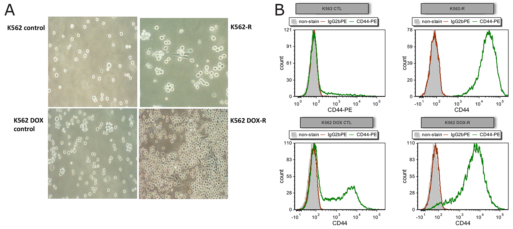 Figure 3: Resistant cell lines K562-R and K562 DOX-R demonstrate increased adhesion compared to their corresponding control lines. (A) Adherent cells were observed in both resistant cell lines, but not in their respective control lines, by light microscopy with 20X magnification. (B) Cells from resistant and control cultures were analysed by flow cytometry for expression of the adhesion marker CD44 (CD44-PE green; unstained grey; IgG2b PE isotype control red).