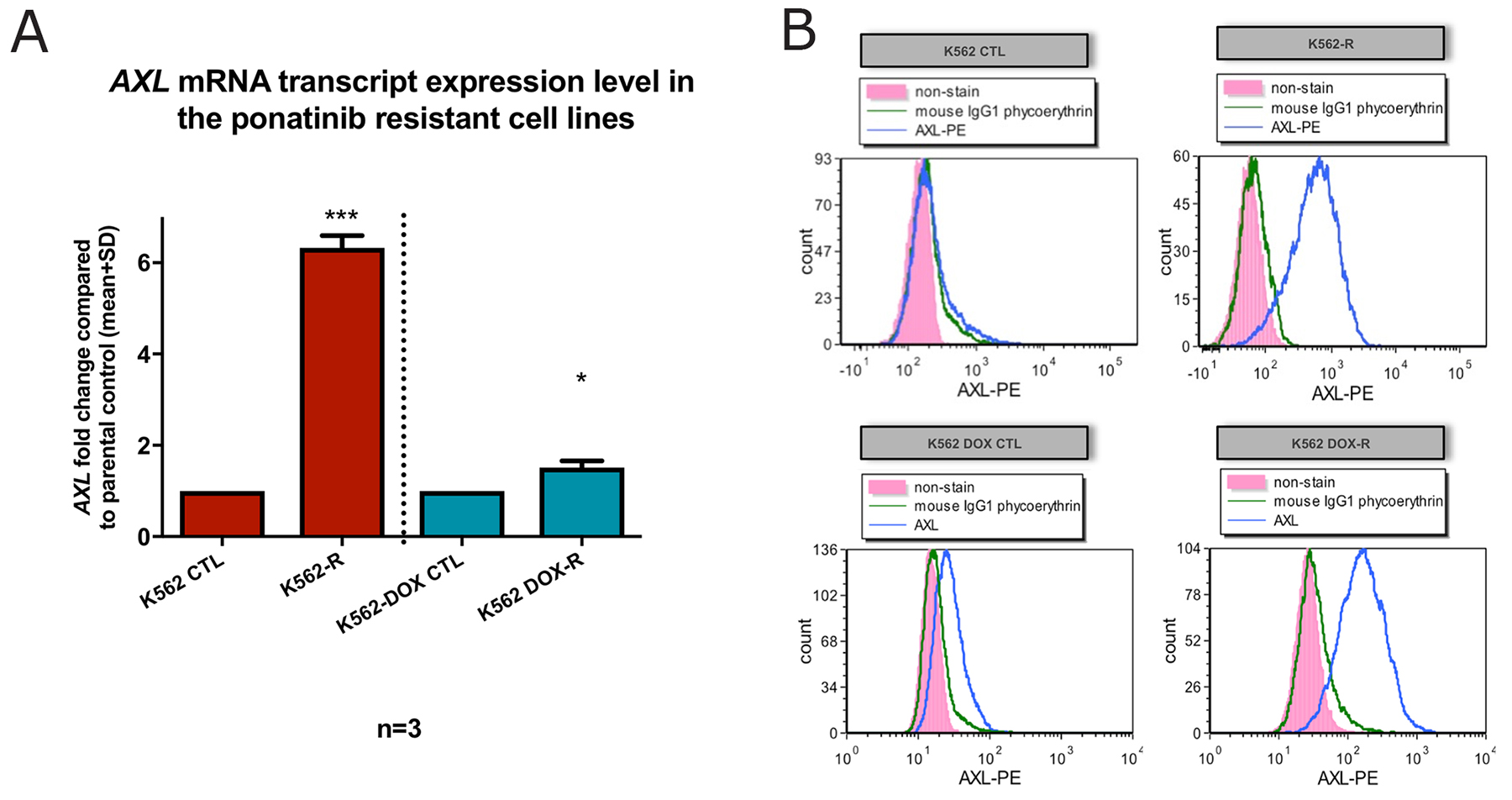 Figure 4: K562-R and K562 DOX-R cell lines demonstrated increased expression of the pro-adhesion protein Axl. (A) AXL mRNA transcript was measured by RQ-PCR and the results were graphed as fold change compared to control lines. GUSB was used as control gene. Error bars represent SD. n=3 for all data. *p<0.05 and ***p<0.005. (B) Flow cytometric analysis for AXL (anti-AXL-PE) was performed on resistant cell lines K562-R and K562 DOX-R and the respective control cell lines K562 and K562 DOX (unstained pink; IgG1 PE isotype control green; Axl PE antibody blue).