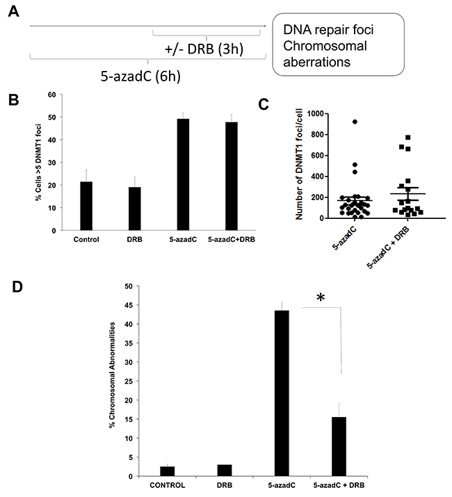 Figure 1: 5-azadC induces transcription-coupled DSBs. (A) Experimental schedule followed. AA8 cells were treated for 6h with 15 μM of 5-azaC. DRB (30μM) was present during the last 3h. (B) In order to evaluate DNMT1 foci, DNMT1-GFP transfected cells were treated as described above, fixed in paraformaldehyde and scored for DNMT1 foci. Cells containing >5 DNMT1 foci were scored as positive. (C) Alternatively the number of DNMT1 foci was scored using Image J software. (D) In order to analyze chromosomal abnormalities after 5-azadC treatment (50μM), cells were treated with colcemid and metaphase spreads were made as described in the material and methods section. The means and SEM of three independent experiments are shown. Data were statistically analyzed using Student’s t-test. Data were considered statistically different when P <0.05 (*) or P <0.01 (**).