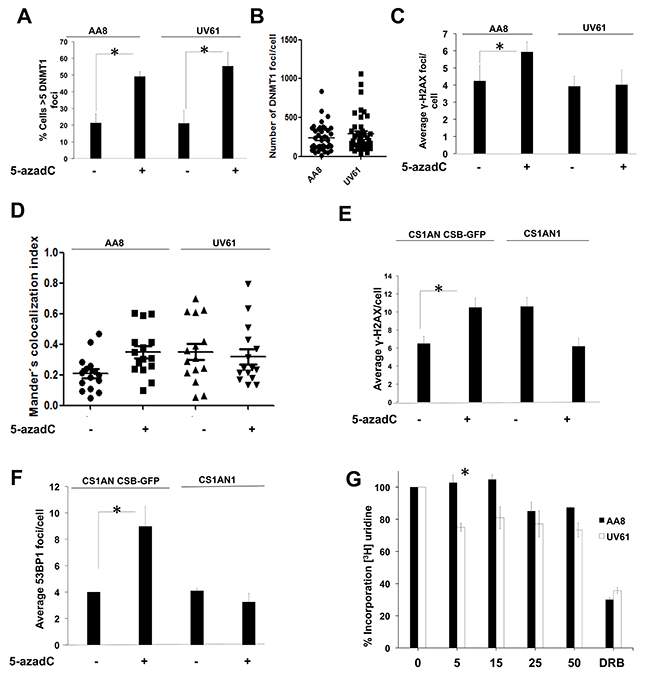 Figure 3: CSB mutant cells have defects in the signaling of the initial DNA damage induced by 5-azadC. (A-B) Similar levels of trapped DNMT1 in wild type AA8 and CSB defective UV61 cells. DNMT1 CSB-GFP cells were treated for 6 h with 15μM of 5-azadC, fixed and prepared for scoring of DNMT1 foci. Cells > 5 foci were scored as positive (A). Alternatively the number of DNMT1 foci/cell is also represented (B). (C) CSB cells have defects forming γ-H2AX foci in response to a short 5-azadC treatment (6 h). (D) 5-azadC induces DNMT1-γH2AX co-localization in a CSB dependent fashion. DNMT1-GFP transfected cells were treated for 6 h with 5-azadC, fixed and immunolabelled for γH2AX. Mander’s co-localization index was employed (Image J). (E and F) Importance of CSB in the formation of γ-H2AX and 53BP1 foci in human cells. CS1AN and CS1AN CSB-GFP cells were treated for 6 h with 5-azadC (15μM), fixed and immunolabelled for the indicated proteins. A clear increase in foci was observed for complemented cells. However CSB cells couldn’t form repair foci. (G) CSB cells present transcription blocks after a short treatment with 5-azadC. AA8 and UV61 cells were treated with increasing doses of 5-azadC for 6 h and labelled with tritiated uridine for 15 minutes in order to monitor transcription rates. CSB cells presented blocks in transcription elongation from the first dose assayed. However for wild type cells blocks are evident only for higher doses assayed.