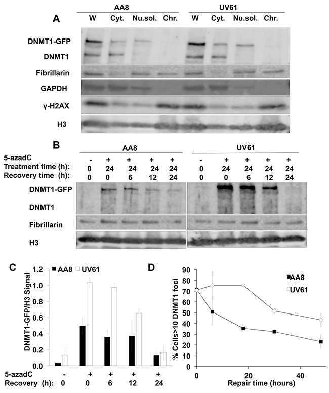 Figure 4: Delayed repair of trapped DNMT1 in CSB mutant cells. (A) Validation of the fractionation protocol followed. AA8 and UV61 cells were transfected with DNMT1-GFP plasmid before lysis. Whole (W) or fractionated lysis were carried out. Cytoplasmic (Cyt), nuclear soluble (Nu.sol.) and chromatin (Chr.) fractions were obtained. Our data show that endogenous and ectopic DNMT1 are equally expressed in both cell types. The expected localization of GADPH, Fibrillarin and γ-H2AX in the cytosolic, nuclear, and chromatin enriched fractions, respectively is shown. (B) Repair of chromatin bound DNMT1-GFP in wild type AA8 and CSB deficient UV61 cells. Cells were treated for 24h with 15μM of 5-azadC and allowed to repair in drug free media for the indicated times. Cells were fractionated and chromatin fractions were loaded analyzed by SDS-PAGE. (C) A densitometric analysis of the chromatin bound DNMT1-GFP in relation to the chromatin marker H3 is shown. (D) Alternatively DNMT1-GFP transfected AA8 and UV61 cells were treated for 24h with 15μM of 5-azadC and allowed to repair in drug free media for different times, fixed and scored for DNMT1 foci in a fluorescence microscope. The means and SEM of two independent experiments are shown. Data were considered statistically different when P < 0.05 (*) or P < 0.01(**).