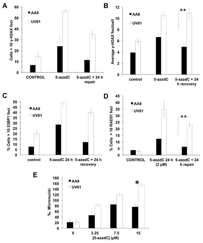 Figure 5: Increased levels of DNA damage in CSB mutant cells after a prolongued 5-azadC treatment. (A–D) AA8 and UV61 cells were treated for 24 h with 5-azadC (2μM) washed and allowed to repair for 24h. Then were fixed and prepared for immunological staining of γ-H2AX (A-B), 53BP1 (C) and RAD51 (D). (E) In order to monitor residual DNA damage after a 24h treatment with 5-azadC, we performed micronucleus assay. Cells were treated with increasing doses of 5-azadC, washed and allowed to repair in cytochalasin B containing media for 18h. Cells were then fixed and scored for the number of micronuclei in binucleated cells. The means and SEM of three independent experiments are shown. Data were statistically analysed using Student’s t-test. Data were considered statistically different when P < 0.05 (*) or P < 0.01(**).