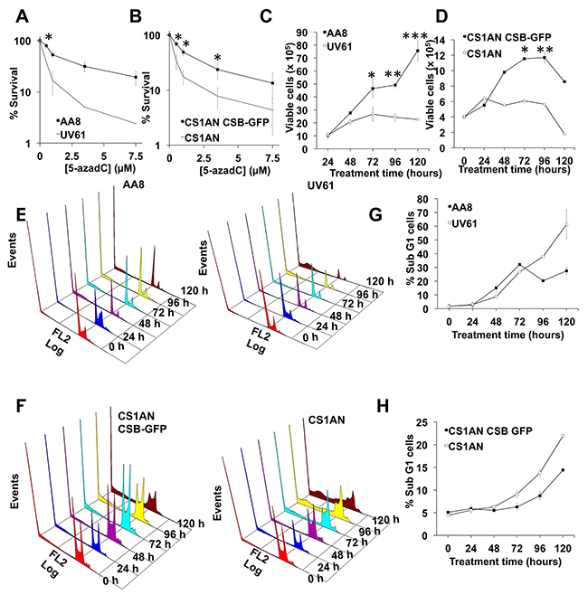 Next we wanted to examine if DNA repair defects observed in CSB mutant cells have a negative consequence in survival. We performed clonogenic assays both in hamster and human cells (Figure 6A–6B). As can be seen, CSB mutant cells (UV61 and CS1AN) presented reduced survival when exposed to 5-azadC. In good agreement with this, CSB mutant cells also showed a reduced growth when they were chronically exposed to 5-azadC (Figure 6C–6D). Cell cycle profiles agree very well with the above data and showed increased levels of cell death (sub-G1 cells) in CSB mutant cells when treated with 5-azadC (Figure 6E–6H).