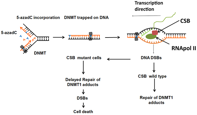 Trapped DNMTs are the primary lesion induced by 5-azadC responsible for tumour cell death [31]. It has been recently shown that trapped Topoisomerases by poisons are obstacles to transcription, causing blocks that act as sensors for the repair of the adducts and the resumption of transcription [24]. Moreover CSB has been recently implicated in this mechanism [30].