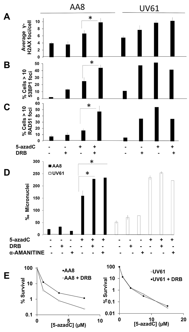 Figure 7: Prolonged transcription inhibition potentiates 5-azadC-induced DNA damage in a CSB dependent manner. (A–C) Cells were treated for 24h with 5-azadC (2μM), DRB (10μM) was added in the last 12h. Cells were then fixed and immunomarked for γ-H2AX (A), 53BP1 (B) and RAD51 (C). (D) DNA damage was also scored with the micronucleus test. Exponential cell cultures were treated 5-azadC (15μM) alone or in combination with DRB (20μM) or α-Amanitin (1μM) and allowed to recover in cytochalasin B containing media for 18h, fixed and the frequency of micronucleus was scored in binucleated cells. The means and SEM of three independent experiments are shown. Data were statistically analyzed using Student’s t-test. Data were considered statistically different when P < 0.05 (*) or P < 0.01(**). (E) Transcription inhibition sensitizes wild type cells but not CSB deficient cells to 5-azadC. AA8 and UV61 cells were seeded at low density and 4h later treated for 36h with increasing doses of 5-azadC. Last 24h cells were in the presence of DRB (20μM). Cells were then washed and allowed to form colonies in drug free media for 7-9 days. Colonies were then fixed and stained with methylene blue in methanol (4g/L). Data are plotted as percentage of survival in relation to control cells (100 %). A representative experiment is shown.