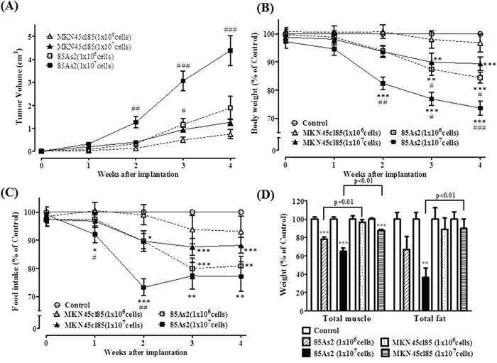 Figure 1: (A) Tumor volume, (B) body weight, (C) food intake, and (D) muscle and fat weight in the MKN45cl85- and 85As2-induced cancer cachexia groups 4 weeks after implantation of cells in nude rats. Rats were inoculated subcutaneously with MKN45cl85 or 85As2 cells in both flanks (1 × 106 or 1 × 107 cells per site) on week 0. Rats inoculated with saline served as the control group. Muscle tissues were expressed as the total weights of greater pectoral, gastrocnemius, tibialis, and soleus. Fat tissues were expressed as the total weights of epididymis, perirenal, and mesentery fat. The data for body weight, food intake, and muscle and fat weight were expressed as percentage (%) of control. Each data point represents the mean ± SEM of 9–10 rats. Each data point about MKN45cl85 (1 × 106 cells) represents the mean ± SEM of five rats. Each column about muscle and fat weight represents the mean ± SEM of five rats. Differences between groups were evaluated using Aspin–Welch’s t-test. *p < 0.05, **p < 0.01, ***p < 0.001 vs. the control group; #p < 0.05, ##p < 0.01, ###p < 0.001 vs. the corresponding cell concentration MKN45cl85 group.