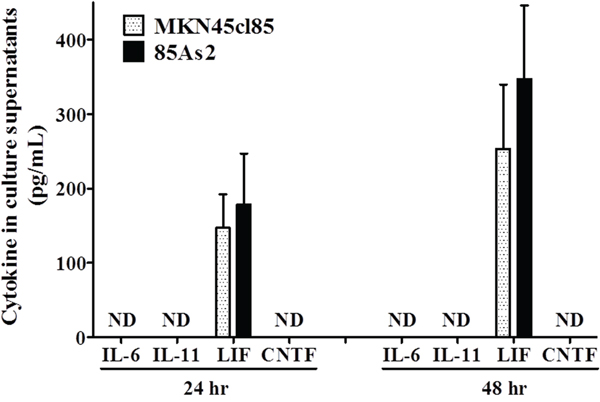 Figure 3: Levels of proinflammatory cytokines belonging to the IL-6 family including human LIF in cell culture supernatants from the MKN45cl85 or 85As2 cell line at 2. 5 × 105 cells/well. Cytokine levels are expressed as the mean ± SEM (pg/mL) values for the three experiments. Human IL-6, IL-11, and CNTF, but not LIF, were not detectable (below the minimum detection limit of the assay). LIF: leukemia inhibitory factor; IL-: interleukin-; CNTF: ciliary neurotrophic factor; ND: not detectable (below the minimum detection limit of the assay).