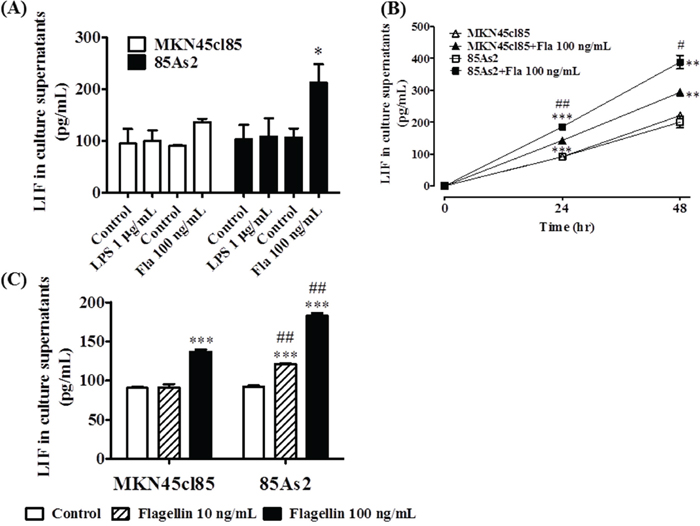 Figure 5: (A) Production of LIF by TLR4 or TLR5 ligand stimulation in MKN45cl85 or 85As2 cells. Both cell lines were treated with LPS (a TLR4 agonist) or flagellin (a TLR5 agonist) for 24 h. (B) Time course of LIF production by TLR5 ligand stimulation in MKN45cl85 or 85As2 cells. Both cell lines were treated for up to 48 h with flagellin (100 ng/mL). (C) Comparison between MKN45cl85 and 85As2 based on enhanced LIF production by flagellin. Both cells were seeded at 2.5 × 105 cells/well in a 12-well plate and treated with flagellin at 10 or 100 ng/mL for 24 h. The levels of human LIF were measured in cell culture supernatants from the MKN45cl85 or 85As2 cell line. LIF levels are expressed as the mean ± SEM (pg/mL) values for three experiments (A) or three-six wells (B, C). Differences between the groups were evaluated using the Aspin–Welch’s t-test. *p < 0.05, **p < 0.01, ***p < 0.001 vs. the corresponding control group (no TLR ligand); #p < 0.05, ##p < 0.01 vs. the corresponding MKN45cl85 group (B, C); Fla: flagellin; LIF: leukemia inhibitory factor; LPS: lipopolysaccharide; TLR: Toll-like receptor.