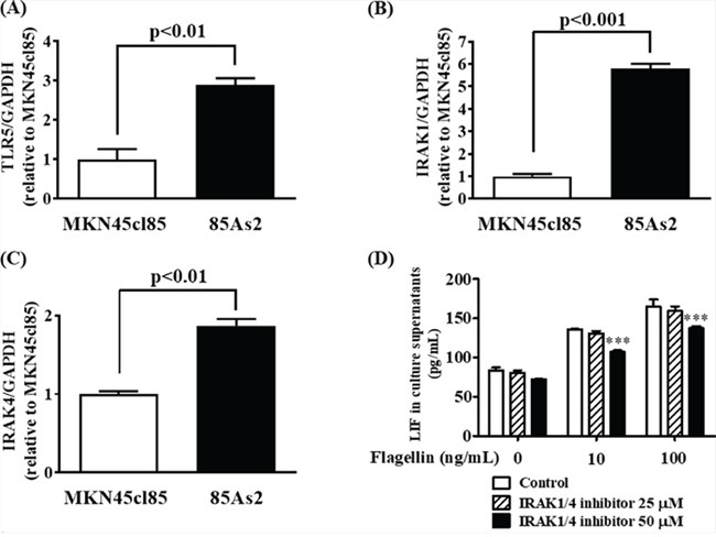 Figure 7: Enhancement of LIF secretion by stimulation of a TLR5 ligand via IRAK-1 and -4 in 85As2 cells. Expression of (A) TLR5, (B) IRAK-1 and (C) IRAK-4 mRNA in MKN45cl85 and 85As2 cells. (D) Inhibitory effects of the IRAK-1/4 inhibitor on the enhancement of LIF secretion by a TLR5 ligand (flagellin) in 85As2 cells. 85As2 cells were stimulated with flagellin (10, 100 ng/mL) for 24 h in the presence or absence of an IRAK-1/4 inhibitor (25 or 50 μM). Each column represents the mean ± SEM of different values of three to six. Differences between the groups were evaluated using the Aspin–Welch’s t-test (A, B, C) and using two-way repeated-measures analysis of variance followed by post-hoc Bonferroni tests (D). ***p < 0.001 vs. the vehicle (0.1% DMSO) group (D). DMSO: dimethyl sulfoxide; GAPDH: glyceraldehyde-3-phosphate dehydrogenase; IRAK: interleukin-1 receptor-associated kinase; LIF: leukemia inhibitory factor; TLR: Toll-like receptor.