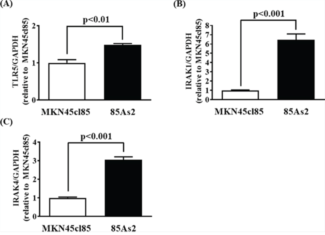 To confirm whether the results of cell culture reflected in vivo conditions, we measured TLR5, IRAK-1, and IRAK-4 gene expression in tumor tissue induced by MKN45cl85 and 85As2 cells. TLR5, IRAK-1, and IRAK-4 gene expression in 85As2 cells was increased compared to that in MKN45cl85 cells; the differences between cell types were significant (Figure 8A–8C).