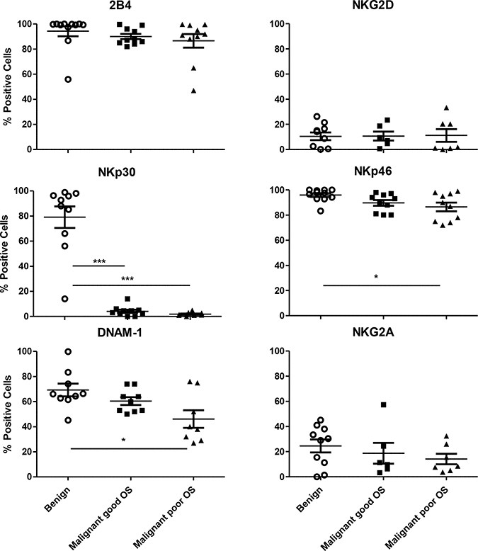 Figure 2: Expression of activating receptors on CD45+CD3-CD56+ NK cells. Percentage positive 2B4, NKG2D, NKp46, NKp30, DNAM-1 and NKG2A NK cells of CD56+ NK cells in benign and malignant peritoneal fluid. The group of malignant ovarian carcinoma ascites patients is divided into lower than median overall survival and higher than median overall survival. Error bars represent mean + SEM. One way ANOVA with Bonferroni correction was performed when comparing the groups. *= p < 0.05, ***= p < 0.001.