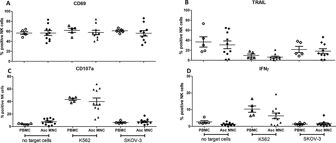 Figure 3: Degranulation assay comparing NK cells in healthy donor (HD) peripheral blood mononuclear cells (PBMCs) with ascites mononuclear cells (MNCs). Percentage CD56+ NK cells positive for (A) CD69, (B) TRAIL, (C) CD107a, (D) IFN-γ, after 4 h stimulation with no target cells, K562 or SKOV-3 tumor cells. Error bars represent mean + SEM. Open symbols depict HD PBMCs, closed symbols depict ascites MNCs. One way ANOVA with Bonferroni correction was performed when comparing the groups.