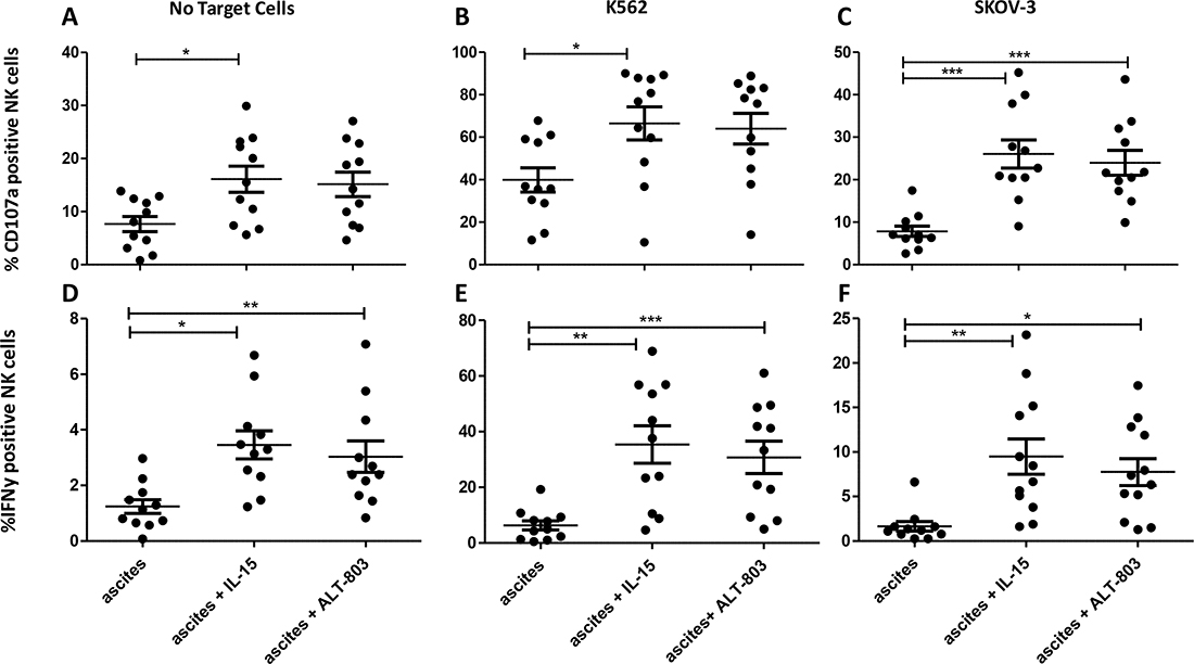 Figure 4: Degranulation assay comparing ascites CD56+ NK cells with and without monomeric IL-15 or ALT-803 stimulation. (A–C) Percentage CD56+ NK cells positive for CD107a after 4 h co-culture with no stimulation (A), K562 cells (B) or SKOV-3 cells (C). (D–F) Percentage CD56+ NK cells positive for IFN-γ after 4 h co-culture with no stimulation (D), K562 cells (E) or SKOV-3 cells (F). Error bars represent mean + SEM. One way ANOVA with Bonferroni correction was performed when comparing the groups. * = p < 0.05, ** = p < 0.01, *** = p < 0.001.