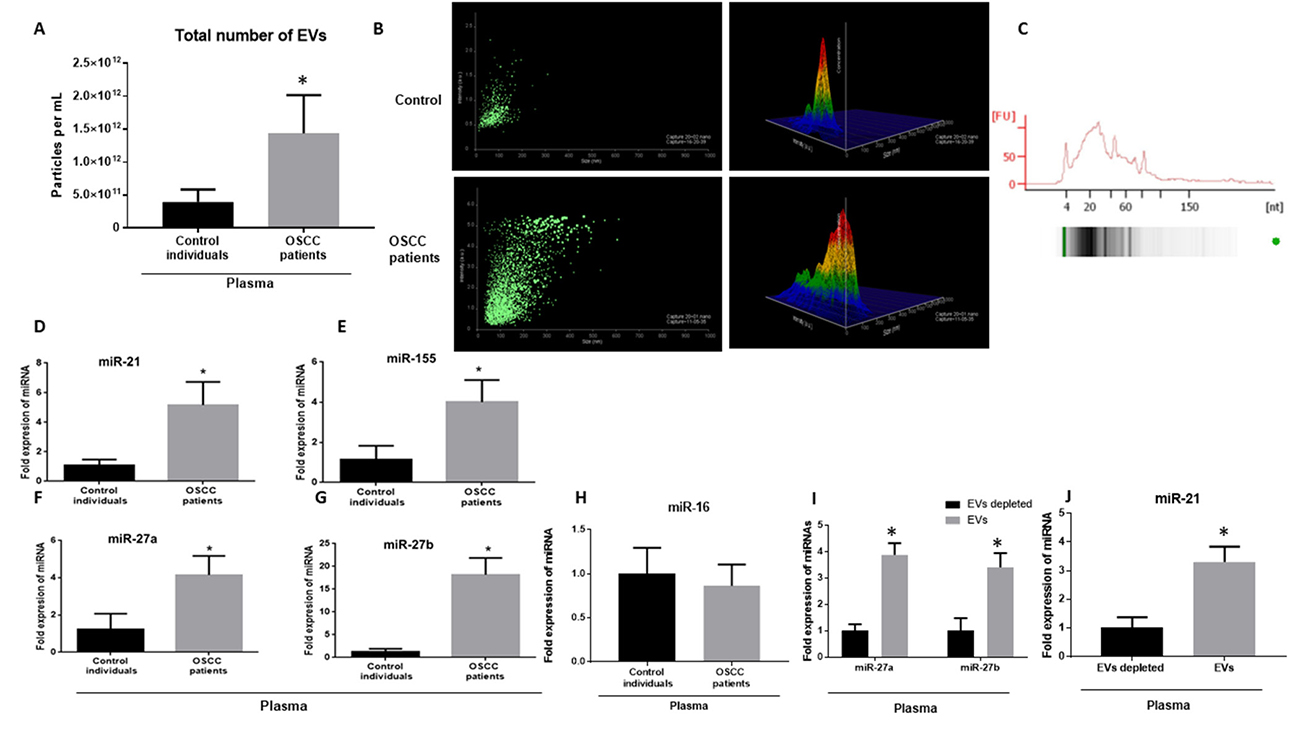 Figure 1: Number of EVs and oncogenic miRNAs are increased in the plasma of patients with OSCC. (A) Total number of EVs in the plasma of patients with OSCC and matched controls were measured by a Nanoparticle Tracking analysis (Nanosight) (n = 34). Each measurement was done in triplicate. (B) The average size of exosomes was measured by Nanoparticle Tracking analysis (NTA) in control and OSCC patients. (C) The graph is representative of small RNA of EVs isolated from plasma of patients with OSCC as analyzed by BioAnalyzer. (D–H) Signature of plasma miRNAs in patients with OSCC and controls was assessed with a TaqMan miRNA qPCR assay for quantification of miR-21, miR-155, miR-27a, miR-27b, miR-16. miR-Cel-39 was used as exogenous normalizer. (I, J) Expression levels of miR-27a, miR-27b, and miR-21 was identified in EV fraction and non-EV fraction of plasma starting from same amount of plasma (100 μl) with a TaqMan miRNA qPCR assay (n = 10 control, 10 OSCC patients). After isolation of EVs RNase A treatment at final concentration of 5 μg/mL for 30 min was done. (*indicates p < 0.05 versus control).