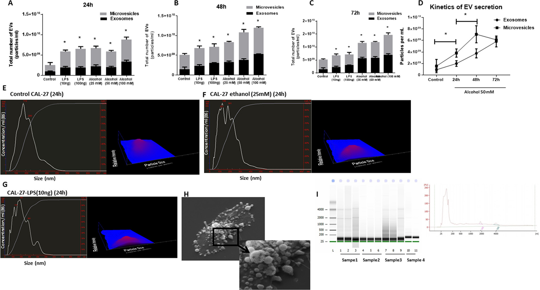 Figure 2: Ethanol treatment increases total number of EVs in a dose- and time-dependent manner in CAL27 cells. CAL27 cells were cultured, and numbers of EVs, exosomes (size <150 nm), and MVs (size >150 nm) were quantified in cell-free supernatant by NanoSight. (A) CAL27 cells were exposed to various dose of ethanol (25 mM, 50 mM, 100 mM), LPS (10 ng, 100 ng) or left untreated for 24 h, and the frequency of vesicles was determined. (B) CAL27 cells were exposed to various dose of ethanol (25 mM, 50 mM, 100 mM), LPS (10 ng, 100 ng), or left untreated for 48 h, and the frequency of vesicles was determined. (C) CAL27 cells were exposed to various dose of ethanol (25 mM, 50 mM, 100 mM), LPS (10 ng, 100 ng), or left untreated for 72 h, and the frequency of vesicles was determined. (D) Kinetic of EV production after challenge with 50 mM ethanol was determined at each condition by enumerating the number of EVs in the cell supernatants. (E) Size distribution of EVs produced by CAL27 cells in 24 h in the unchallenged condition. (F) Size distribution of EVs produced by CAL27 cells challenged by 25 mM ethanol in 24 h. (G) Size distribution of EVs produced by CAL27 cells challenged by 10 ng LPS in 24 h. Nanosight device was calibrated with 100 nm polystyrene beads before each set of measurements. All measurements were done in triplicate from 6 independent samples in each group. (H) Scanning electron microscopy image of untreated CAL27 cells are shown (×3000 magnification). The blown-up image of the selected region (×7500 magnification) in the cancer cells shows the shedding of EVs on the surface of the cells. (I) EVs originated from CAL27 cells carry small noncoding RNAs in size range of miRNAs. Figure is the representation of EV-encapsulated small RNA profile obtained from 4 independent sample preparations. (*indicates p < 0.05 versus control).