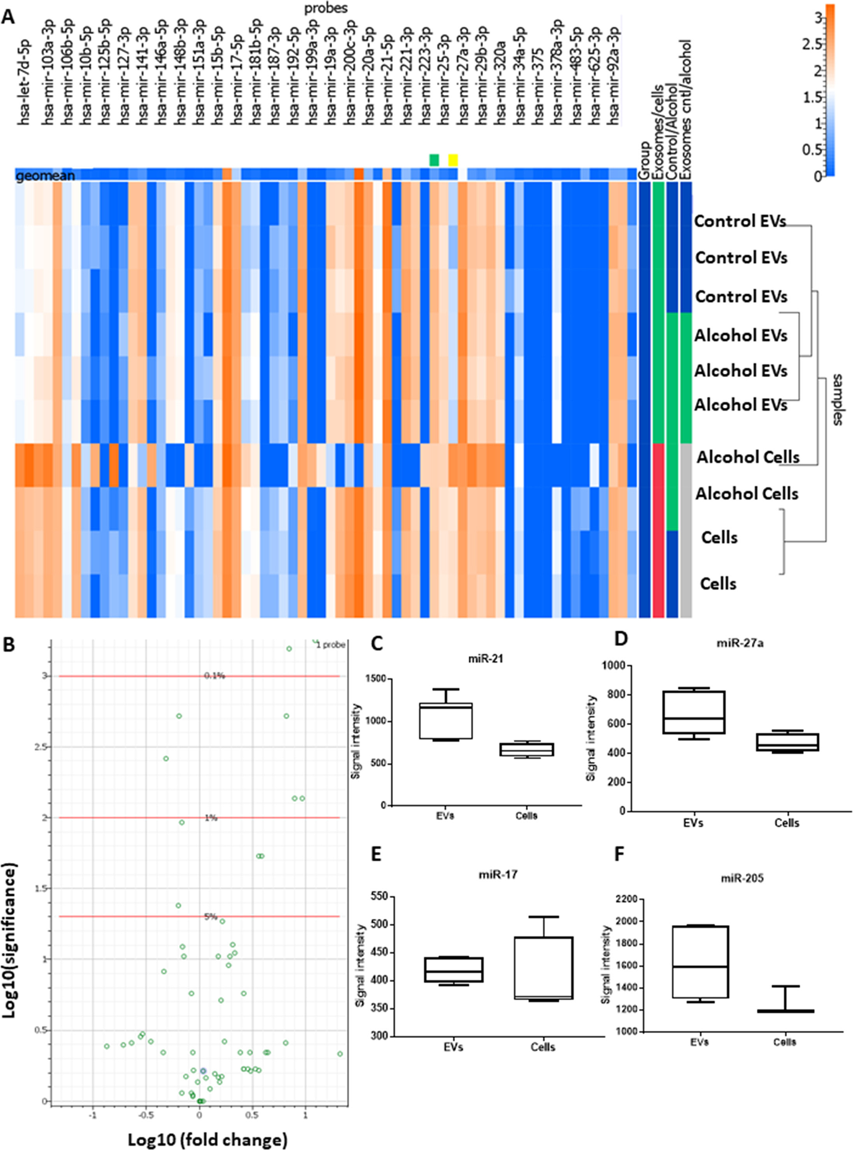 Figure 3: Characterization of miRNA cargos of EVs secreted by OSCC cells (CAL27). (A) Heat map of differentially expressed EV-associated miRNAs in oral squamous cell carcinoma cell lines (CAL27) using Firefly BioWorks miRNA assay normalized to the geometric mean of most stable miRNAs. (B) Volcano plot of significant relative to the fold change expression of miRNAs for cell versus EVs. (C–F) Normalized signal intensity of miR-21, miR-27a, miR-205, and miR-17 in CAL27 cell and EVs (*indicates p < 0.05 versus control).