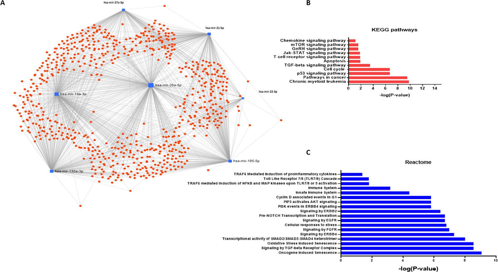 The Firefly miRNA multiplex assay (Firefly™ bioworks, Cambridge, USA) was used to profile EV-associated miRNA isolated from CAL27 cells and cells in different conditions (non-challenged and challenged with 25 mM ethanol) for a targeted list of 68 miRNAs in the oncogenic panel. Total RNA (12 μl) was used to run the Firefly standard protocol and the abundance of RNA probes analyzed with a Millipore Guava 8HT flow cytometer (EMD Millipore). Analysis and visualization of data were performed using a Firefly™ Analysis Workbench. Intensities were transformed to log ratio for each probe. Negative control values for each probe was subtracted from each sample and normalization was done based on the geometric mean of most stable reference genes based on the software built in the algorithm. Signal log ratios were computed by using a t-test and false discovery rate was controlled at 5% using the Benjamini-Hochberg procedure. The identified miRNAs were clustered in by K mean clustering method and heat-map was constructed. The miRNAs that were specifically enriched in EVs were subjects to functional network analysis through miRNet which combine the target interaction data from 11 well-annotated miRNA datasets including PhenomiR, SM2miR, TarBase, HMDD, PharmacomiR and miR2Disease (27). Network visualization and functional enrichment analysis were performed based on Reactome, Gene Ontology, and KEGG to identify dysregulated pathways associated with enriched miRNAs in EVs by a hypergeometric test as well as small molecules interactions (27).