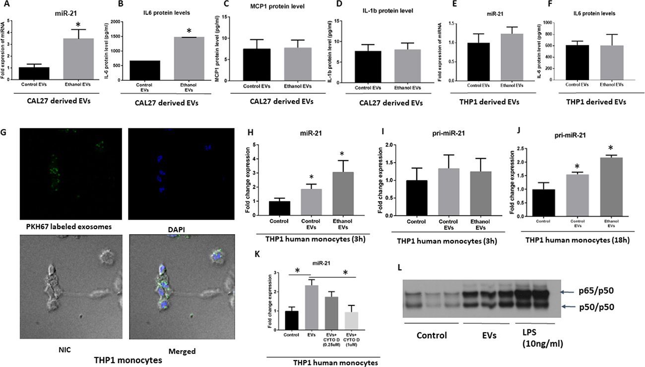 Evidence regarding molecular and cellular mechanisms underlying cancer development indicates that immune changes occur during cancer development and progression. Alcohol is considered one of the risk factors for oral squamous cell carcinoma (OSCC) and associated with poor prognosis which is also a modulator of innate immunity [28]. Here, we present a detailed analysis of the role of EVs and associated miRNAs in cellular crosstalk in OSCC. We demonstrate that EVs are detectable in significantly higher quantity in circulations of patients with OSCC and the majority of extracellular RNA are packed in the EVs. Oncogenic miRNAs were detectable in high quantity in the circulating EVs and plasma of patients with OSCC. We also performed a series of experiments to characterize the EVs shed by oral cancer cells in resting state and in response to the alcohol challenge. We found that alcohol challenge increases EV production in a dose-dependent manner and subset of oncogenic miRNAs are specifically enriched in the EVs released form the cancer cells. Mechanistically, uptake of EVs derived from oral cancer cells by monocytes causes activation of the NF-κB pathway and establishment of the pro-inflammatory milieu. These findings suggest that EV-associated miRNAs may be a marker, as well as a functional component, of cancer cells and immune cells interactions. In summary, our study describes a previously unknown pro-inflammatory circuit through which OSCC-derived EVs can induce the formation of pro-inflammatory phenotype in monocytes.