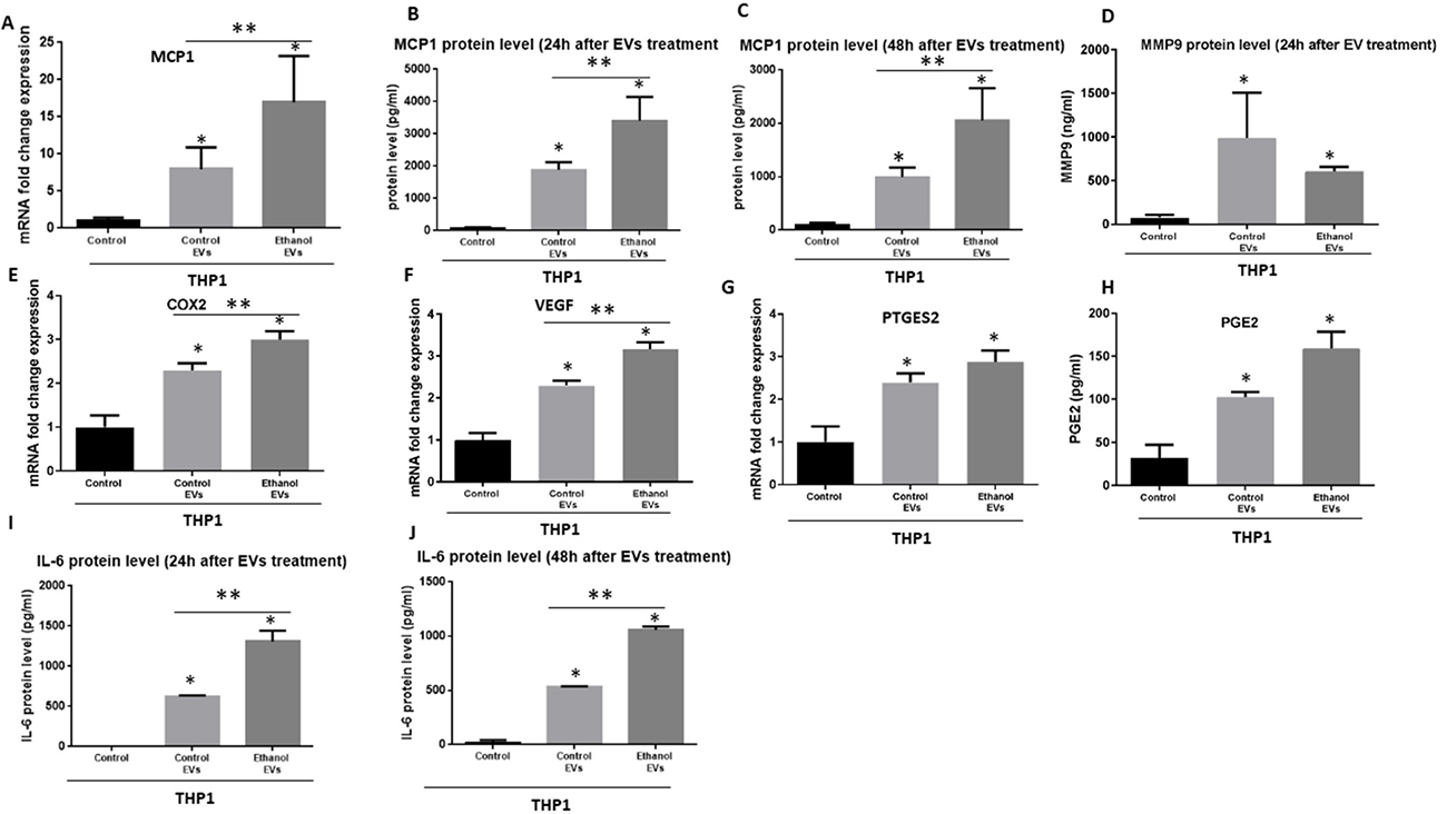CAL27 cells were purchased from ATCC and were cultured in Dulbecco’s modified medium (DMEM) plus 10% exosome-depleted FBS (Exo-FBS™) (Mountain View, CA, USA), and 1% penicillin/streptomycin (Gibco®, NY, USA). THP1 monocytes were cultured in RPMI media containing 10% exosome depleted FBS and 1% penicillin/streptomycin at 37° C in a 5% CO2 atmosphere. For evaluation of effects of ethanol administration, 25 mM, 50 mM, and 100 mM of ethanol were added to the cells for various time points (24 h, 48 h, and 72 h). At desired time points, conditioned media was collected, and EVs were isolated or quantified using a Nanoparticle Tracking Analysis (NTA) system as described previously [62].