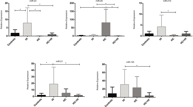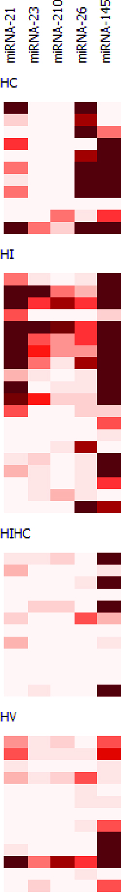 To our knowledge, this is the first study in which miRNAs expression was investigated in subjects affected by different types of hypoxia. The main finding of this study is that there are two distinct patterns of miR-expression associated with intermittent and chronic hypoxia, and it appears that the first one has a stronger impact on miR-expression than the second, at least amongst miRNAs that we have selected. In particular, four of them (miR-23, miR-210, miR-21 and miR-145) are usually more expressed in the HI group than the other ones analyzed in this study, while only one (miR-26) was highly expressed in subjects with HC. Curiously, when both conditions are present together, there is a reduction of all miRNAs expression, as if there was a sort of “annihilation effect”.
