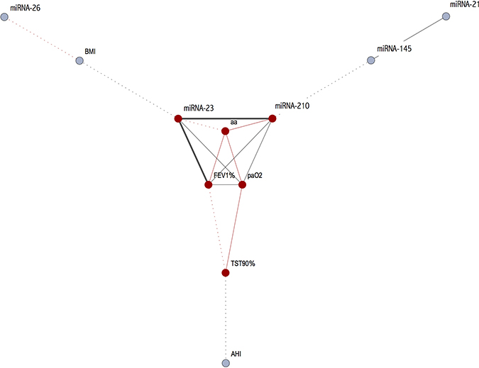 Figure 4: Correlations amongst the miRNAs and the main clinical parameters (black line: positive correlation; red line: negative correlation; dashed line r < 0.40; for continuous line the thickness is proportional with correlation index).