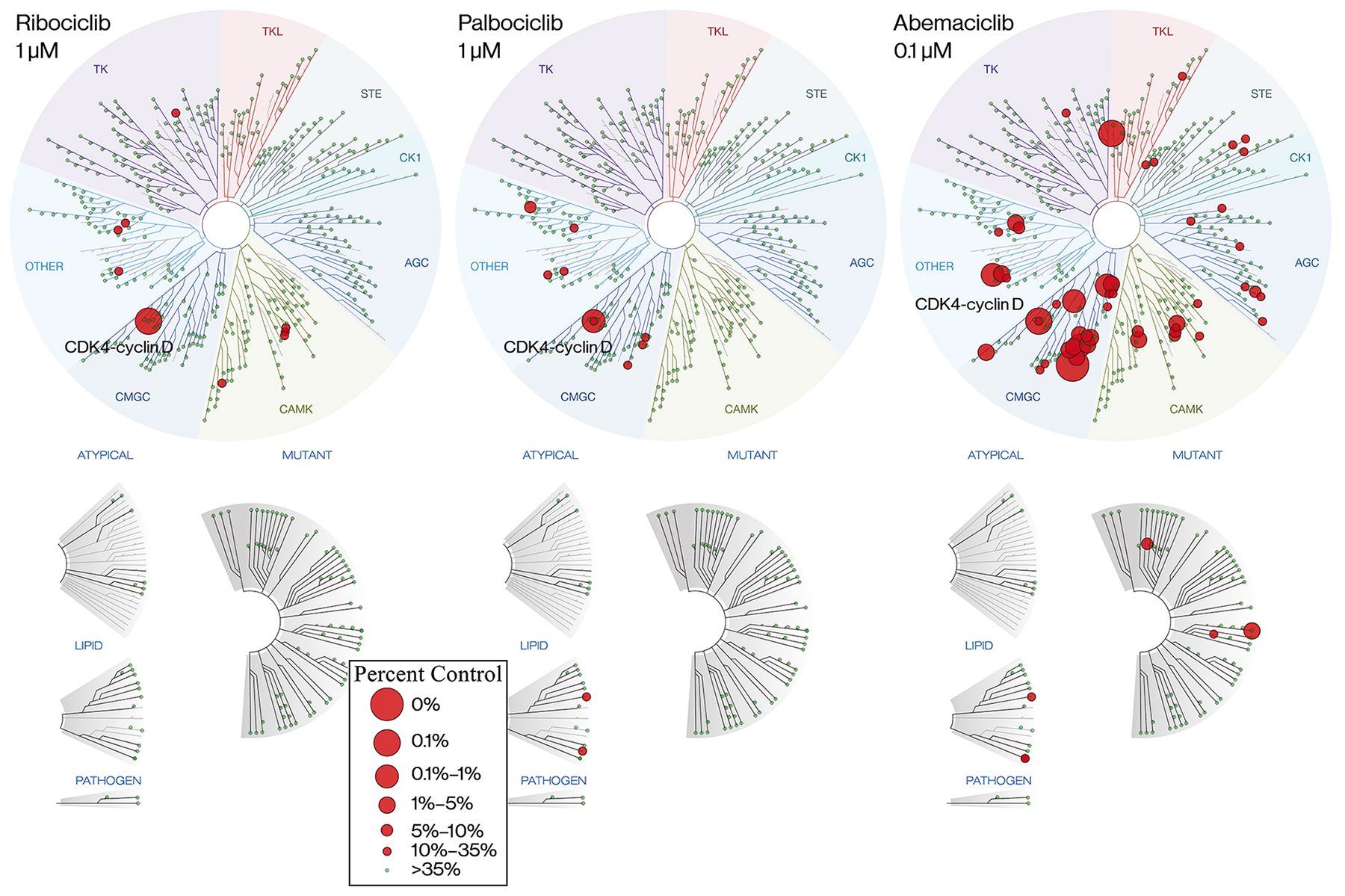 Kinase reactions were carried out in 384-well microtiter plates (30 μL per reaction) in 1× assay buffer (50 mM HEPES-Na, pH 7.5, 10 mM MgCl2, 1 mM dithiothreitol, 0.02% Tween® 20, 0.05% bovine serum albumin) and analyzed with the Dako EnVision® Detection System. Additional information can be found in the Supplementary Methods. CDK4/6 inhibitors were subjected to the DiscoveRx KINOMEscan selectivity screen [47]. Images were generated using the TREE spot™ software tool and reprinted with permission from KINOMEscan. Kinases that bind were marked with red circles if <35% of the respective recombinant kinase was captured on the immobilized ligand in the presence of the indicated concentration of CDK4/6 inhibitor, normalized to a dimethyl sulfoxide control. Larger circles indicate a higher affinity of binding. Binding of 468 kinases (excluding CDK6) or their mutant variants at different concentrations by ribociclib, palbociclib, and abemaciclib was tested.
