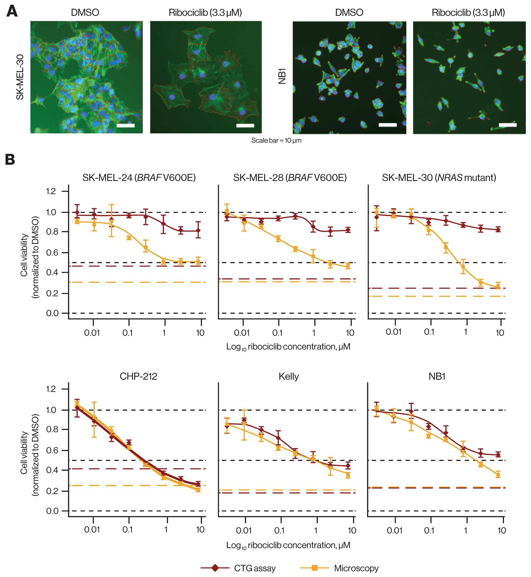 Figure 2: Discrepancy of ribociclib effects in vitro comparing ATP quantification and microscopy. (A) Cells after 72-hour ribociclib treatment (3.3 μM) vs DMSO. Ribociclib treatment affected the number of NB1 cells without apparent size changes and resulted in increased size of SK-MEL-30 cells accompanied by a reduction in number (original magnification × 10; tubulin [green] and DNA/nuclei [blue] stained with anti–-α-tubulin FITC antibody and Hoechst 33342, respectively). (B) Dose-response curves comparing cell viability by ATP quantification and microscopy in 3 melanoma cell lines (upper panel) and 3 neuroblastoma cell lines (lower panel). In melanoma cell lines, only microscopy robustly detected growth inhibition by ribociclib, while in neuroblastoma cell lines, both readouts yielded similar results. Red and yellow broken lines indicate the pretreatment signal (CTG and number of cells before addition of ribociclib). Black broken lines indicate cell viability of 0, 0.5, and 1. ATP, adenosine triphosphate; CTG, CellTiter-Glo®; DMSO, dimethyl sulfoxide; FITC, fluorescein isothiocyanate.