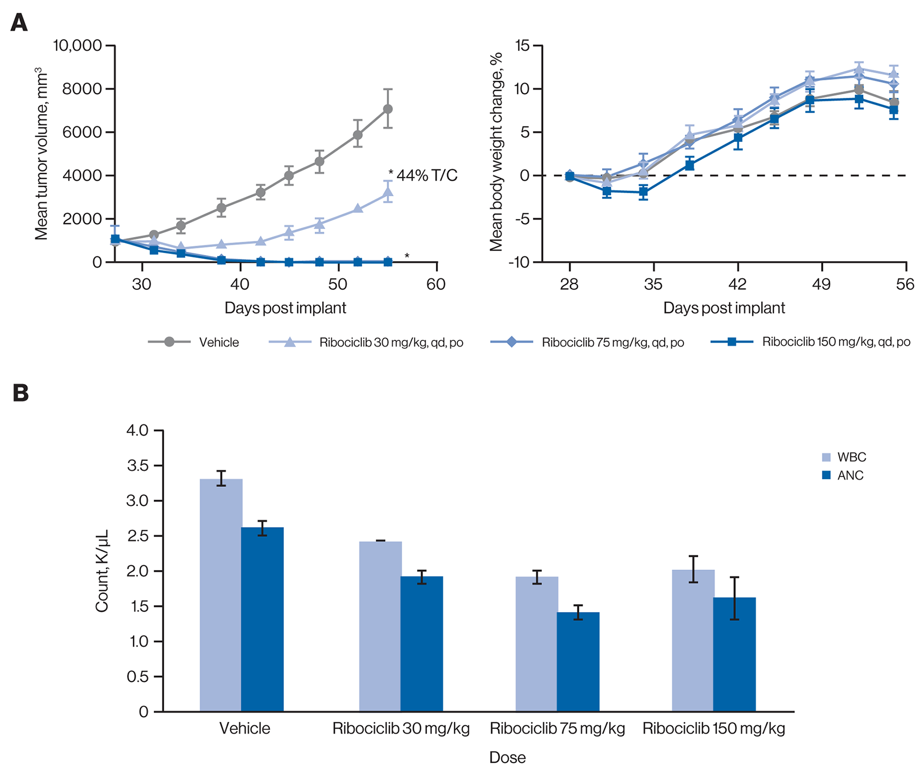 Figure 3: Ribociclib induces robust inhibition of tumor growth in vivo, concomitant with on-target myelosuppression. (A) Ribociclib induced total tumor regressions at the 75 mg/kg and 150 mg/kg doses (left panel) with only minimal transient body weight loss at the 150 mg/kg dose (right panel) in the JeKo-1 rat xenograft model. Error bars show the SEM. *P<0.05 compared with vehicle control (one-way analysis of variance followed by post hoc Tukey [n=7]). (B) Dose-dependent reductions of WBCs and ANC were observed in rats treated with ribociclib. Maximum inhibition was seen with the 75 mg/kg and 150 mg/kg doses. Black broken line indicates mean body weight change of 0. Error bars show the SEM. ANC, absolute neutrophil count; po, orally; qd, once daily; SEM, standard error of the mean; T/C, treatment/control; WBC, white blood cell.
