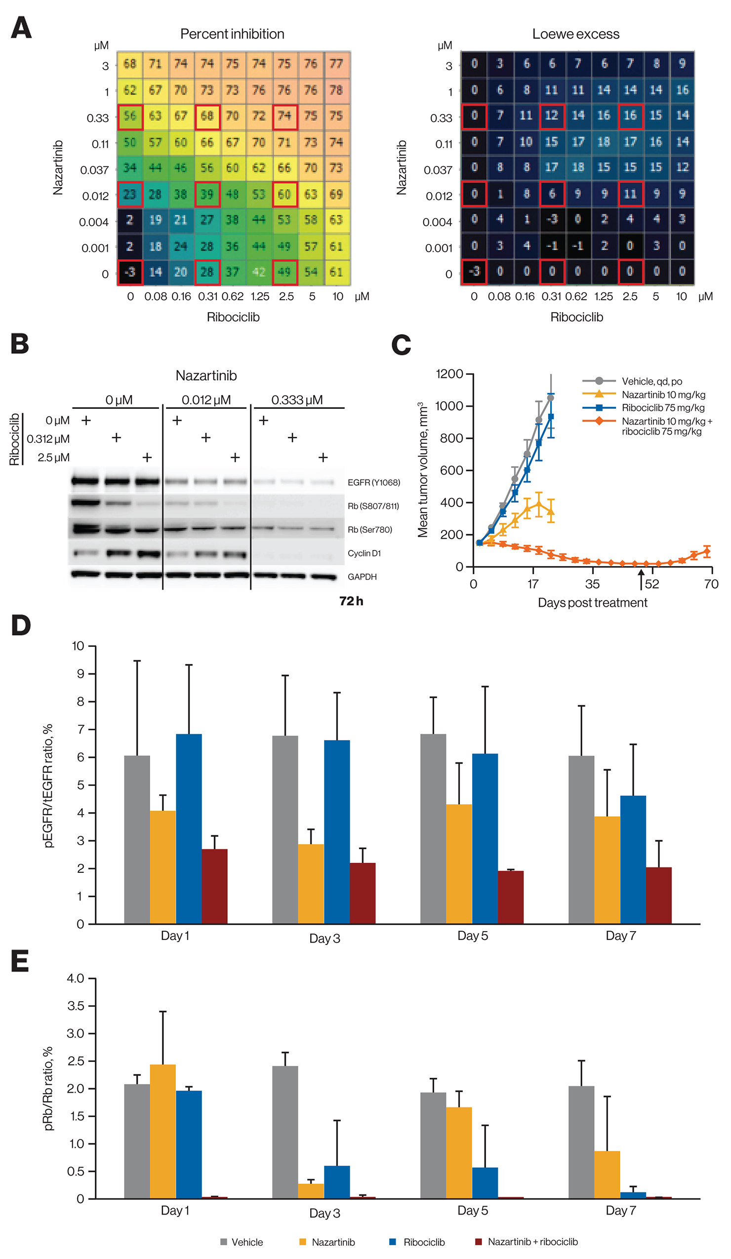 Figure 4: Ribociclib and nazartinib show combinatorial benefit and profound tumor regression in EGFR-mutant lung cancer models at a low nazartinib dose. (A) Treatment of EGFR-mutant NCI-H1975 lung cancer cells with nazartinib and ribociclib in a dose-matrix experiment. Growth inhibition and excess inhibition over single-agent treatment according to the Loewe excess model are shown. Calculations have been described previously [34]. (B) Western blot analysis of NCI-H1975 cells after treatment as indicated. The respective treatment conditions are also marked by red squares in panel A. Images were collected using the GE Healthcare ImageQuant LAS 4000 imager and software (catalog number: 28955810, version 1.2, build 1.2.1.119) and were cropped, aligned, and annotated using Microsoft PowerPoint. (C) Effect of in vivo treatment with nazartinib and ribociclib alone and in combination on tumor volume at indicated doses in the EGFR-mutant NSCLC cancer PDX model LU1868. Arrow indicates end of treatment. Error bars show the SEM. (D) pEGFR/tEGFR ratios for different treatment regimens in PDX model LU1868. Error bars show the SEM. (E) pRb/Rb ratios for different treatment regimens in PDX model LU1868. Error bars show the SEM. PDX, patient-derived xenograft; NSCLC, non-small cell lung cancer; pEGFR, phosphorylated epidermal growth factor receptor; pRb, phosphorylated retinoblastoma protein; SEM, standard error of the mean; tEGFR, total epidermal growth factor receptor.