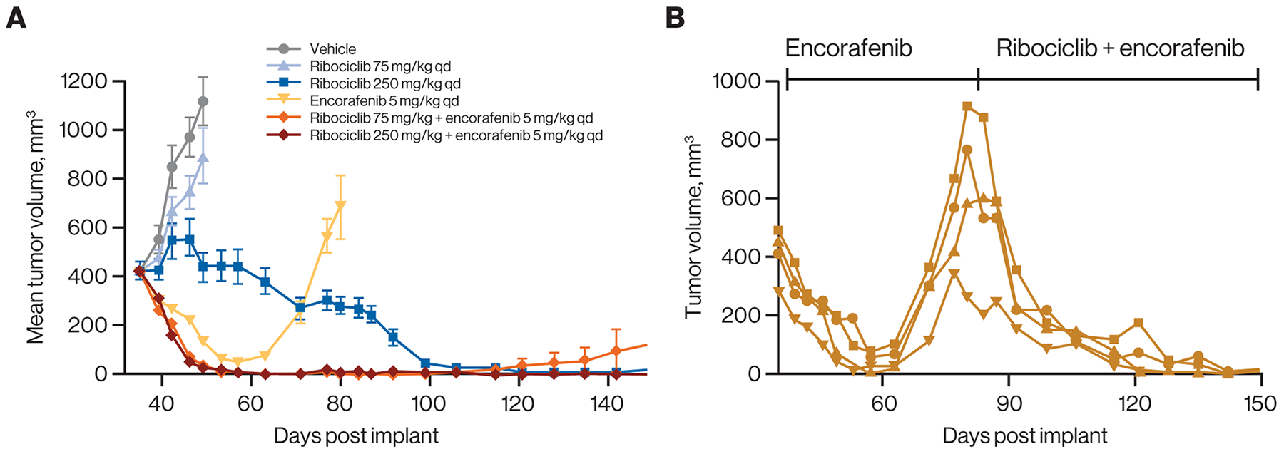 Figure 5: Ribociclib prevents emergence of resistance under treatment when combined with encorafenib in a BRAF-mutant melanoma model. (A) Treatment of HMEX1906 BRAF V600E mutant melanoma PDX models with the indicated regimens. Ribociclib showed delayed single-agent activity at 250 mg/kg, but not at 75 mg/kg. As expected, encorafenib induced tumor regression followed by rapid emergence of resistance, while addition of 75 mg/kg of ribociclib prevented the emergence of resistance. Error bars show the SEM. (B) Mice (n=4) received daily encorafenib treatment from day 35 to 80 when resistant tumor relapsed on treatment. These mice then received daily combination treatment of 250 mg/kg ribociclib and 5 mg/kg encorafenib for the remaining duration of treatment until day 150. Individual responses are shown. PDX, patient-derived xenograft; qd, once daily; SEM, standard error of the mean.