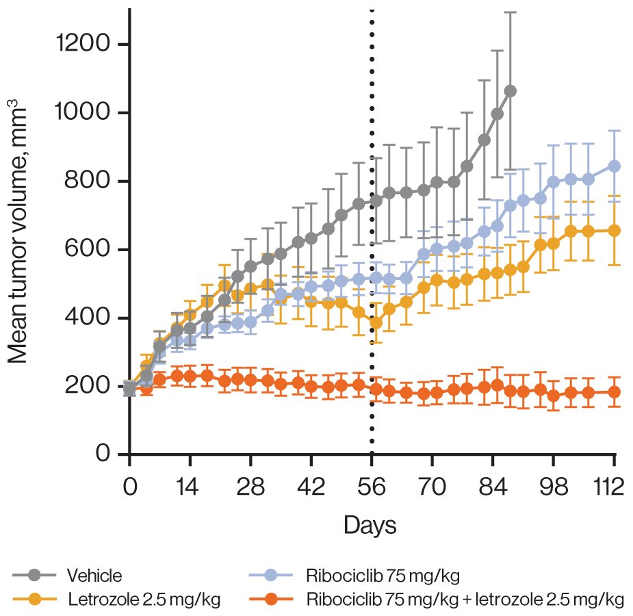 Figure 6: Ribociclib improves response depth when combined with letrozole in a hormone-dependent breast cancer model. Combination of ribociclib with letrozole in the HBCx-34 tumor model. Treatment was administered for 56 days (black dotted line). Error bars show the standard error of the mean.