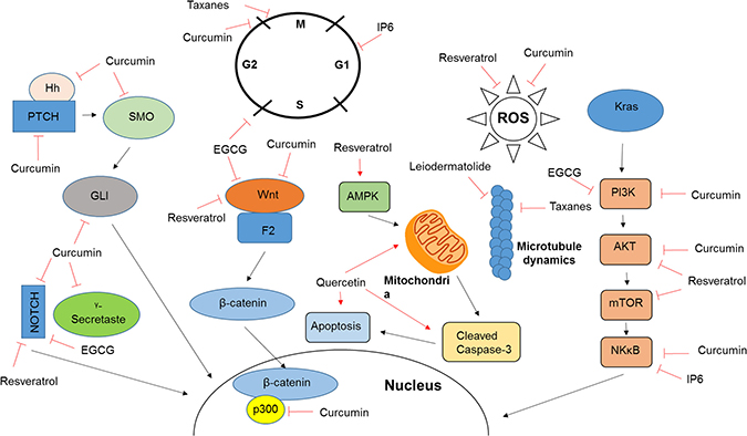 Figure 1: Mechanism of action of natural compounds. Included are the mechanisms of action for a number of compounds discussed in this review. As further discussed in the appropriate sections, the majority of natural compounds target a wide variety of cellular pathways which contributes to the varying observations made by different studies and inhibits the transition into clinical care.