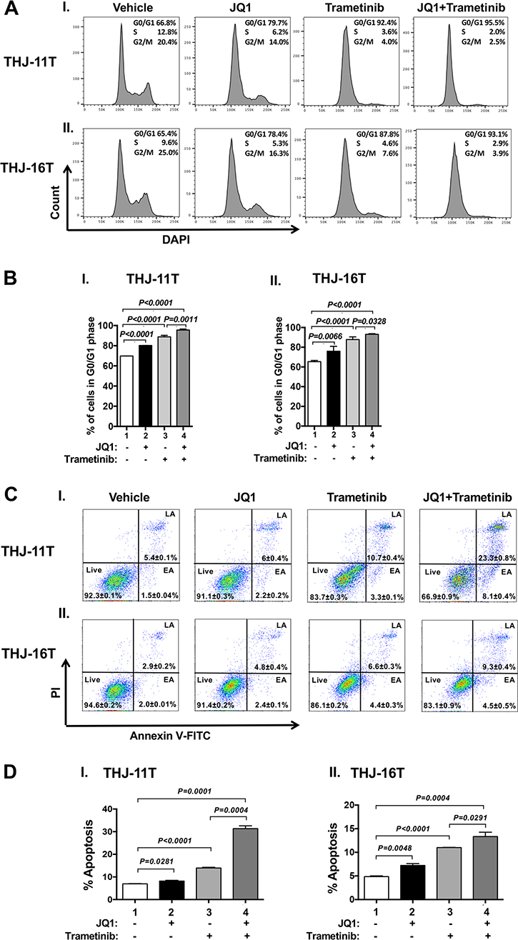 Figure 2: Effect of JQ1, trametinib, and the combined treatment on cell cycle progression (A and B) or apoptosis (C and D) of ATC cells by cytometric analysis. (A) Cell cycle profiles of THJ-11T (I) and THJ-16T cells (II). The average percentages of cell populations of different cell cycle phases were shown in the upper-right corner. (B) The graphs showed percent of G0/G1 phase for vehicle, JQ1, trametinib and combined treatment JQ1 with trametinib in THJ cell lines. Cell cycle phase was quantified by DAPI staining, followed by FACS analysis in THJ cell lines. Values are shown as means ± SD. (n = 3). (C). THJ-11T (I) and -16T cells (II) were treated with vehicle, JQ, trametinib, and both JQ1 and trametinib for 48 hours. After treatment, cells were collected and subjected to Annexin V and propidium iodide (PI) staining followed by flow cytometric analysis for apoptotic cells. (D) The populations of late and early apoptotic cells were quantified and graphed as shown in (I) and (II) for THJ-11T and -16T cells, respectively. The experiment was done in triplicates. Values are shown as means ± SD. (n = 3).