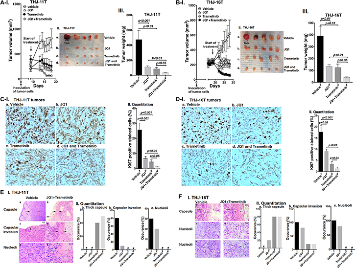 Figure 3: (A–B) The combined treatment of JQ1 and trametinib promoted tumor regression in anaplastic thyroid tumors in athymic mice. Equal numbers of THJ-11T cells (5 × 106) or THJ-16T cells (5 × 106) were injected into the flanks of mice before treatment. When tumors reached the size of 200 mm3, vehicle, JQ1, or trametinib was administered for 10 days. Tumor growth curves (I), tumor size (II) and tumor weight (III) for THJ-11T (A) and THJ-16T (B) are shown (n = 5 for each treatment). Ki67 staining of sections of tumor derived fromTHJ-11T cells (C-I) or from THJ-16T cells (D-I) as described in Methods. The treatment for each panel is marked. The Ki67 positively-labeled cells were counted, and % of Ki-67-positive cells is graphed in (C-II and D-II). The p values are indicated. (E-I and F-I). The H & E slides were prepared according to Methods. Representative pathohistological characteristics of xenograft tumors of ATC cells treated with vehicle (a, c, e) or with combined treatment (b, d, f) are marked. (E-II and F-II). % occurrence of capsular thickness (panel a), capsular invasion (panel b), and large nucleoli (panel c) were quantitified from H & E stained sections derived from THJ-11T cells (E-II, n = 5) and THJ-16T cells (F-II, n = 5). # denotes not detectable.