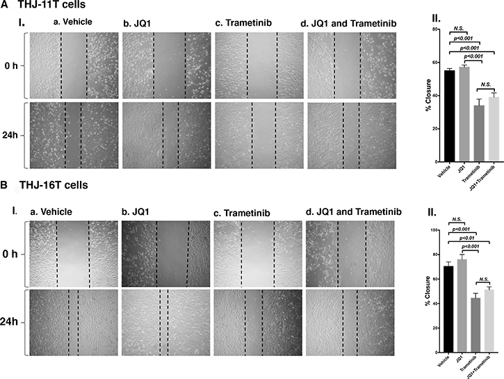 Figure 4: Trametinib and the combined treatment of JQ1 and trametinib inhibit ATC cell migration. Monolayer scratch-induced migration assay. (A-I) THJ-11T cells or (B-I) THJ-16T cells treated with vehicle, JQ1, trametinib or combined JQ1 and trametinib were scratched with a 20-μl plastic pipette tip at 0 h and 24 h. (A-II) Quantitative analysis of wound-induced migration assay from (A-I). (B-II) Quantitative analysis of wound-induced migration assay from (B-I). The results are presented as mean ± SD of measurements of areas from six wells for each group.