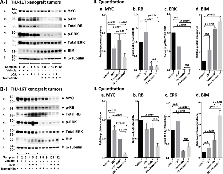 Figure 5: The combined treatment of JQ1 and trametinib synergistically decreased the abundance of MYC expression and altered downstream effectors in xenograft tumors. (A and B) Total protein extracts were prepared from xenograft tumors induced by THJ-11T cells (A) and THJ-16T cells (B). (I) Western blot analysis was carried out for MYC (a), p-RB (b), total RB (c), p-ERK (d), total ERK (e), BIM (f), and α-tubulin (g) as loading control. (II) Band intensities in (I) were quantified for comparison among vehicle-, JQ1-, trametinib-, JQ1and trametinib-treated xenograft tumors. The experiments in each treatment were analyzed in triplicates with three independent experiments. The p values are shown (n = 3).