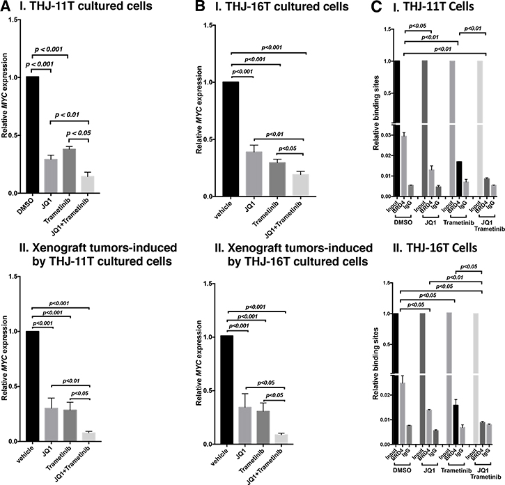 That MYC protein levels were decreased by JQ1, trametinib, and combined treatment prompted us to examine the effect of inhibitors on the expression of MYC at the mRNA levels. Through inhibition of the binding of BRD4 to acetyl-lysines on chromatins, JQ1 is known to selectively inhibit transcription of the MYC gene in many tumors [9, 12, 24]. We found that the expression of MYC mRNA was inhibited by JQ1, trametinib, and the combined treatment by 70.8%, 62%, and 85.6%, respectively, in THJ-11T cells (Figure 6A-I). Consistently, in xenograft tumors induced by THJ-11T cells, the MYC mRNA expression was also similarly inhibited by JQ1, trametinib, and the combined treatment (69.8%, 71.4%, and 92.2%, respectively; Figure 6A-II). The extent of the inhibition of MYC mRNA expression was positively correlated with the MYC protein levels in that the combined treatment synergistically suppressed the expression of MYC at the mRNA and protein levels (see panel a of Figure 5A-I and 5B-I).