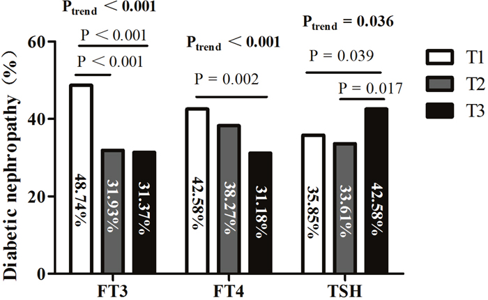 The presence of macroalbuminuria decreased across the three tertiles according to FT3 (Ptrend= 0.001) and FT4 (Ptrend< 0.001) levels and increased across the three tertiles according to TSH (Ptrend= 0.048) levels (Figure 2).