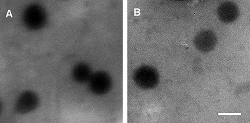 Figure 3: TEM images of (A) blank GSH/pH-NS and (B) SL-loaded GSH/pH-NS (scale bar = 200 nm).