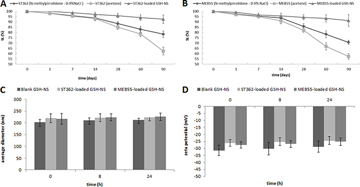 Figure 4: In vitro stability studies. Chemical stability over time of (A) ST362 and (B) MEB55; (C) Average diameters and (D) Z-potentials of GSH/pH-NS formulations incubated in cell culture medium (t = 0, 8 and 24 hours). Each value represents the mean ± SD of 3 experiments.