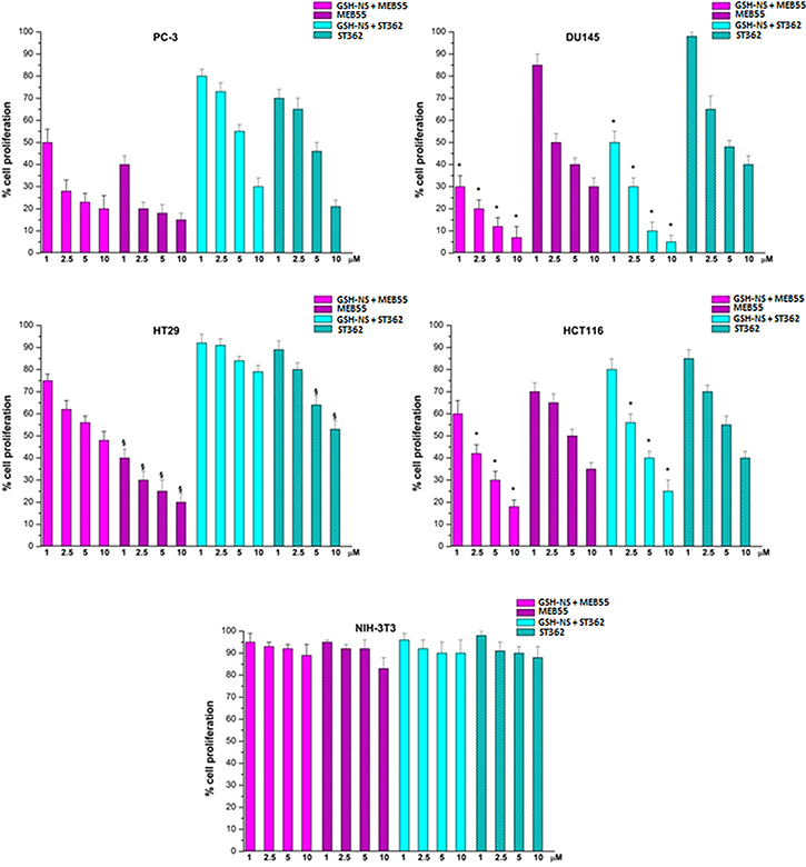We next evaluated the effects of MEB55- and ST362-loaded GSH/pH-NS on the growth of DU145 and PC-3 prostate cancer cells in culture. These cell lines displayed high and low GSH content, respectively [35]. Cell viability was analyzed after treatment of the cells for 24 h with a range of concentrations (0.1–10 μM) of free SLs or SL-loaded GSH/pH-NS using MTT assays. We found that MEB55 (both free and loaded in GSH/pH-NS) inhibited the proliferation of both cell types to a greater extent than ST362. Both SL-loaded GSH/pH-NS inhibited the proliferation of the DU145 cells (high GSH content) to a greater extent than the corresponding free drugs at all concentrations analyzed (Figure 6). In contrast, the SL-loaded GSH/pH-NS did not show statistically different effects on cell proliferation in PC-3 cells (low GSH content), compared to the corresponding free drugs, suggesting that the activity of the GSH/pH-NS is dependent upon the intracellular GSH content. The IC50 values for the free SLs and SL-loaded GSH/pH-NS are shown in Table 2.
