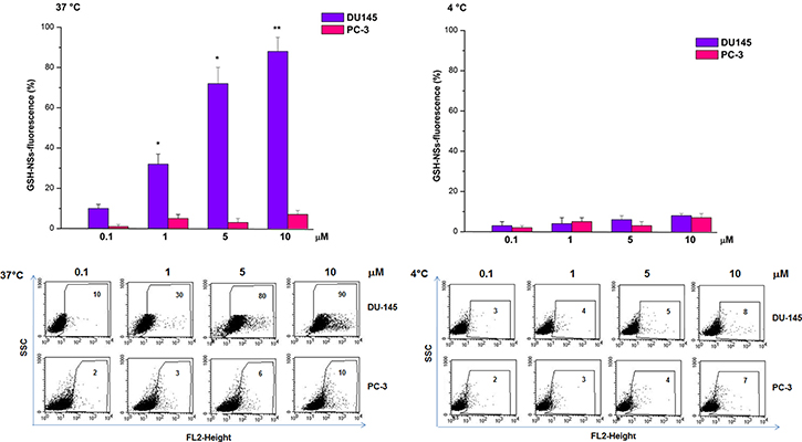 Figure 10: Flow cytometry analysis of the uptake of the GSH/pH-NS by prostate cancer cells. DU-145 or PC-3 cells treated with the GSH/pH-NS at 37°C (left panel) or 4°C (right panel). The data are expressed as the mean ± SEM for four independent experiments (**p < 0.01, *p < 0.05 compared to controls, paired T-test). Fluorescence activated cell sorting plots represent a single experiment.