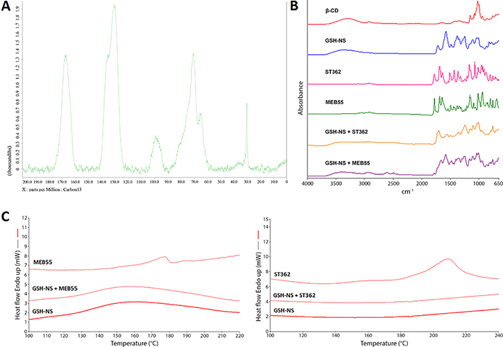 Figure 2: (A) 13C CP/MAS NMR (40–200 ppm) spectra of blank GSH/pH-NS, acquired with a spinning rate of 20 kHz at room temperature; (B) FTIR spectra of MEB55- and ST362-loaded GSH/pH-NS; (C) DSC thermograms of MB55- and ST362-loaded GSH/pH-NS.