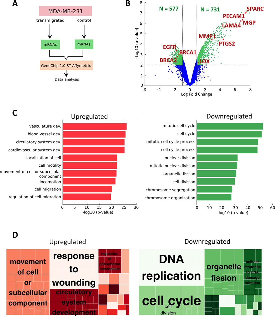 Figure 1: Genetic markers of metastasis progression from microarrays data. (A) Schematic representation of the procedure to examine differential gene expression after cell extravasation. (B) Volcano plot of microarrays data. The data for all genes are plotted as the log2 fold change versus the negative log10 of the adjusted p-value. Thresholds are shown as dashed lines. The upregulated DEG (p-value < 0.01 and log FC > 1) and downregulated DEG (p-value < 0.01 and Log FC < −1) are represented as green dots. The red and labeled dots correspond to markers of late-metastatic stage. (C) The top 10 Gene Ontology (GO) enriched Biological Processes (BP) terms for the DEG of trans-migrated MDA-MB-231 cancer cells. The respective red (upregulated terms) and green (downregulated terms) bar charts represent the −log10 (p-value) of the GO term. (D) REVIGO treemaps of over-represented GO terms processed (p-value < 0.01) for upregulated (left) and downregulated (right) BP lists. Each large rectangle, called supercluster, represents a cluster of loosely related GO terms (small rectangles) that are displayed in different colors. The size of the rectangles reflects the corrected p-value (i.e. larger rectangles represent the most significant GO terms).