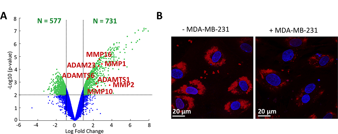 Going deeper into our microarray dataset analysis, we then investigated the expression of glycocalyx rearrangement proteins. CTC extravasation has been linked with partial disruption of the endothelial glycocalyx [6]. It is known that cancer cells secrete MMPs and other degrading enzymes including heparanase and hyaluronidase which affect components of the EC glycocalyx. Moreover, the inhibition of MMP activity by doxycycline was shown to reduce glycocalyx shedding [43], while degradation of HS and hyaluronic acid induced the release of growth factors or cytokines and impaired glycocalyx function, thus compromising endothelial cell-cell junctions and endothelial homeostasis [44]. In our gene expression data, we observed an upregulation of MMPs, along with members of the ADAM and ADAMTS superfamilies. Among the upregulated MMPs, MMP10 and MMP16 functions remain unclear; however, as part of the metalloproteinase family, we can speculate about their possible involvement on EC surface rearrangement alongside MMP1 and MMP2. Similarly, the direct action of ADAM and ADAMTS proteases on glycocalyx impairment has not been demonstrated. Still, ADAMs are members of the same superfamily of MMPs (metzincin zinc-dependent metalloprotease) and are known to play a role in cell adhesion and rearrangement of cell surface molecules [45], while ADAMTSs are secreted molecules which bind to the ECM. From those observations, we postulate that ADAMs might have the potential to work with other metalloprotease superfamilies such as ADAMTSs and MMPs on rearranging the EC surface coating. We furthermore confirmed experimentally the direct negative impact of MDA-MB-231 cancer cells on EC glycocalyx, showing a less intense lectin staining on ECs when close to cancer cells (Figure 2B).