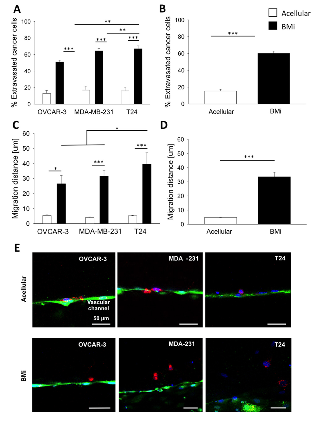 Figure 4: Extravasation and migration data. (A) Bar plots of mean ± SEM of the percentage of extravasated cancer cells considering OVCAR-3, MDA-MB-231 and T24 cells in acellular or BMi microenvironment condition. (B) Bar plots of mean ± SEM of % of extravasated cancer cells combining the data for all the three cell types in either acellular or BMi microenvironment condition. (C) Bar plots of mean ± SEM of the migration distances from the endothelial layer for OVCAR-3, MDA-MB-231 and T24 cells in acellular or BMi microenvironment condition. (D) Bar plots of mean ± SEM of % of the migration distances from the endothelial layer for all the three cell types in either acellular or BMi microenvironment condition. Statistical significance was evaluated by a two-tailed t-test. *=p < 0.05; **=p < 0.01, ***=p < 0.001. (E) Representative images of the 3 different cancer cell types extravasated into the extracellular matrix in acellular (top panel) or BMi (bottom panel) microenvironment condition. Endothelial layer (green), cancer cells (red), cell nuclei (blue).